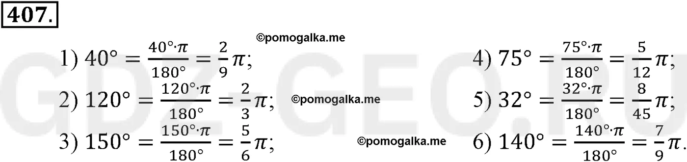 Найти радианную меру угла, выраженного в градусах: 1) 40°; 2) 120°; 3) 150°; 4) 75°; 5) 32°; 6) 140°.