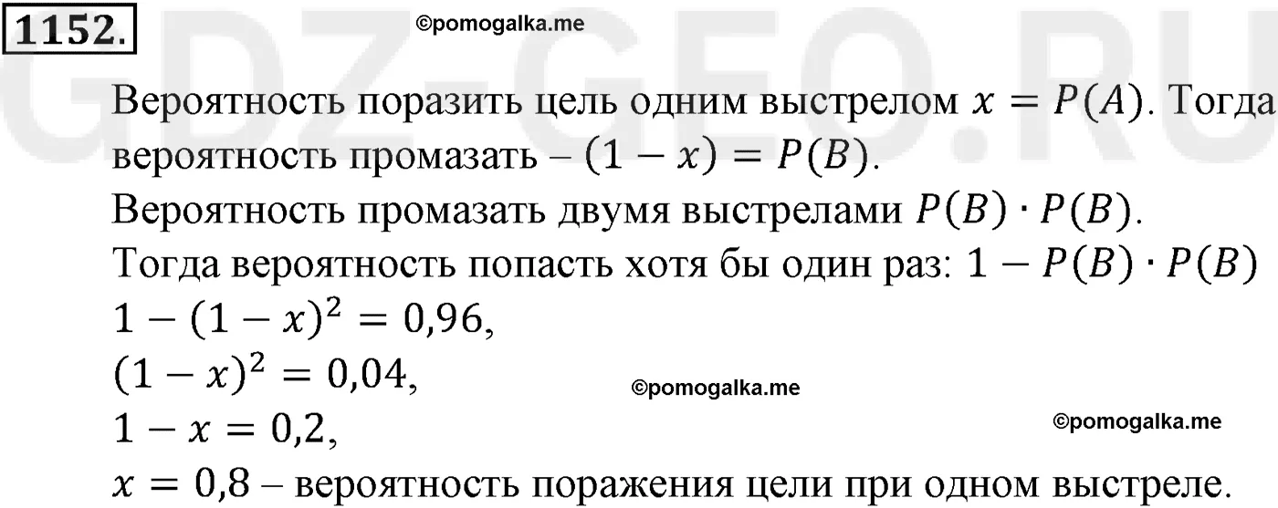 Вероятность того, что цель будет поражена хотя бы одним из двух выстрелов, равна 0,96. Полагая, что каждый раз вероятность поражения цели при одном выстреле одна и та же, найти эту вероятность.