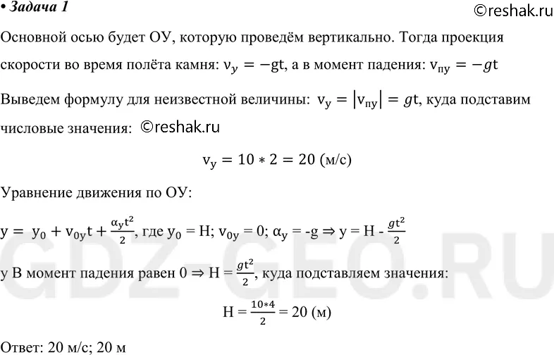 1. Камень, упав с обрыва, достиг поверхности воды через 2 с. Чему равна высота обрыва? Определите модуль конечной скорости камня.