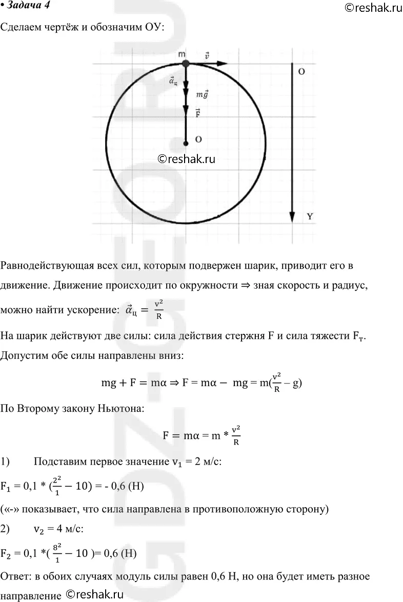 4. Жёсткий стержень длиной 1 м с прикреплённым к нему шариком массой 100 г вращается равномерно в вертикальной плоскости. Определите модуль и направление силы, с которой стержень действует на шарик в верхней точке, при скоростях шарика 2 м/с и 4 м/с.