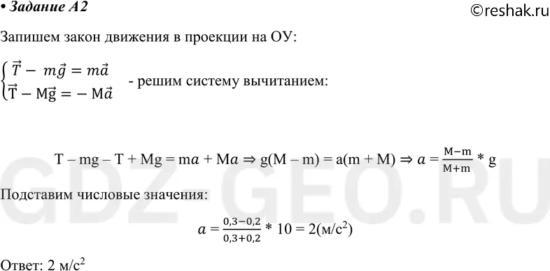 A2 Брусок массой М = 300 г соединён с бруском массой m = 200 г невесомой и нерастяжимой нитью, перекинутой через невесомый блок (см. рис.). Чему равен модуль ускорения бруска массой 200 г?