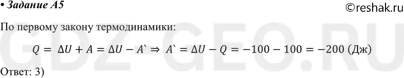 A5. Идеальный газ получил количество теплоты 100 Дж, и при этом внутренняя энергия газа уменьшилась на 100 Дж. Чему равна работа, совершённая внешними силами над газом? 1) 100 Дж 2) 200 Дж 3) -200 Дж 4) 0