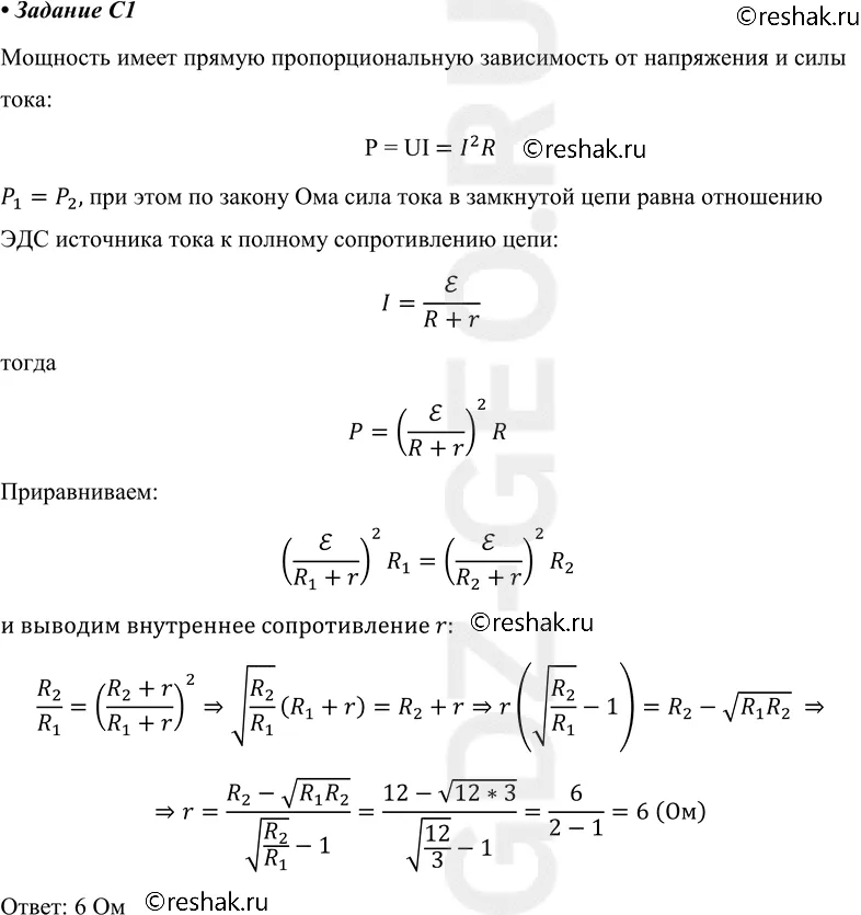 C1 Резисторы поочерёдно подключают к источнику постоянного тока. Сопротивления резисторов равны соответственно 3 Ом и 12 Ом. Мощность тока в резисторах одинакова. Чему равно внутреннее сопротивление источника тока?