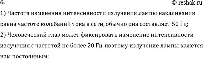 6. Человеческий глаз может фиксировать изменение интенсивности получения с частотой не более 20 Гц. По цепи лампы накаливания идет переменный ток. Почему мы видим постоянное, а не пкльсирующее излучение лампы?