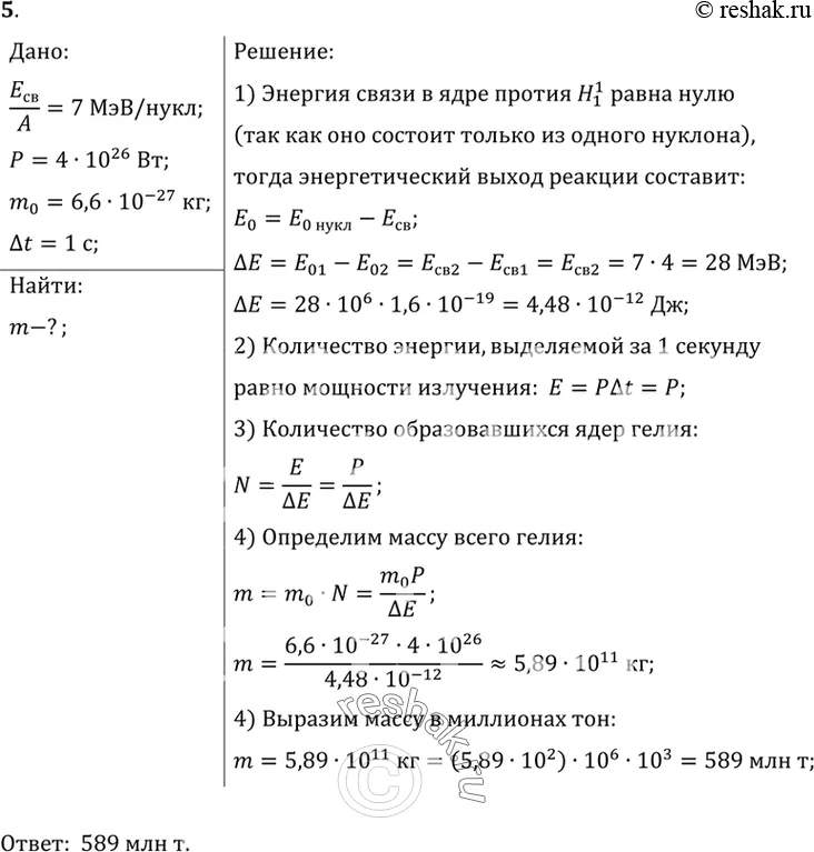 5. Излучение Солнца обысловлено энергией, выделяющейся в термоядерной реакции, при которой четыре ядра водорода 1 1Y рождают ядро гелия 4 2He. Энергия связи ядра 4 2He составляет 7МэВ/нуклон. Чему равна масса гелия, возникающего в Солнце ежесекундно, если мощность излучения Солнца составляет 4*10^26 Вт?Масса ядра гелия 6,6*10^-27 кг. Ответ выразите в миллионах тонн.