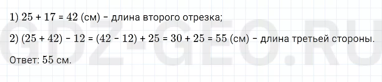 Длина первого отрезка 25 см, длина второго отрезка на 17 см больше, чем длина первого, а длина третьего на 12 см меньше, чем сумма длин первого и второго отрезков. Найди длину третьего отрезка.