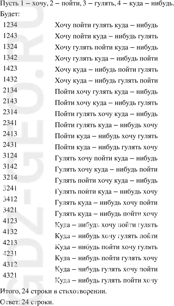 768 Поэт-модернист написал стихотворение, в котором первая строка — «Хочу пойти гулять куда-нибудь», а остальные строки все разные и получены из первой перестановкой слов. Какое наибольшее количество строк может быть в этом стихотворении?