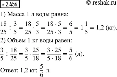 2.456. Масса 3/5 л воды Мёртвого моря равна 18/25 кг. Чему равна масса 1 л воды? Чему равен объём 1 кг воды?