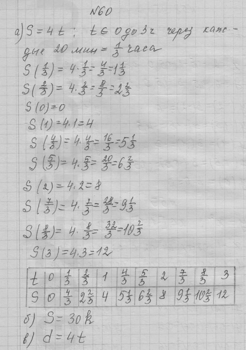 а) Человек идёт со скоростью 4 км/ч. Запишите путь s, пройденный человеком, как функцию от времени t. Составьте таблицу, показывающую пройденный путь за время от 0 до 3 ч через каждые 20 мин.