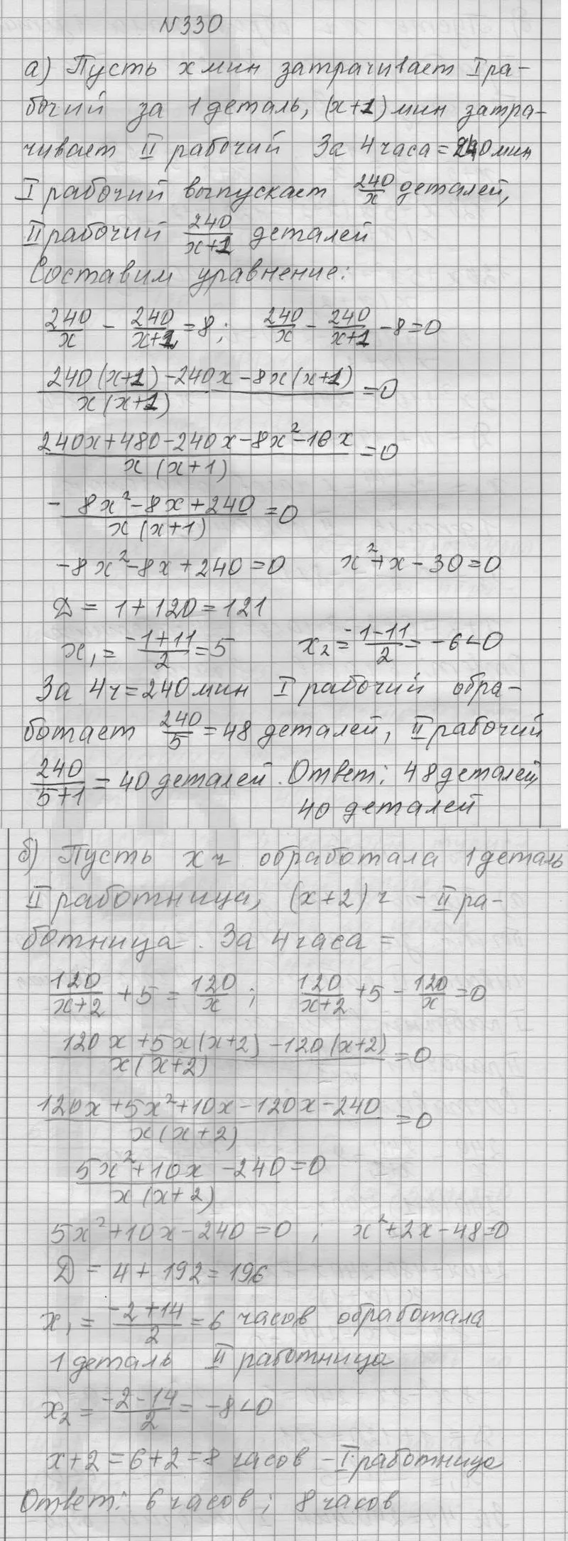 а) На обработку одной детали первый рабочий затрачивает на 1 мин меньше, чем второй. Сколько деталей обработает каждый из них за 4 ч, если первый рабочий обрабатывает за это время на 8 деталей больше, чем второй?