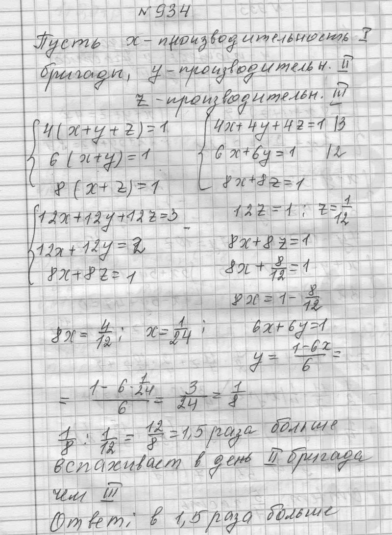 Три тракторные бригады вместе вспахивают поле за 4 дня. Это же поле первая и вторая бригады вместе вспахивают за 6 дней, первая и третья вместе — за 8 дней. Во сколько раз больше вспахивает в день вторая бригада, чем третья?