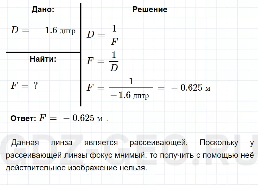 Оптическая сила линзы равна -1,6 дптр. Каково фокусное расстояние этой линзы? Можно ли с её помощью получить действительное изображение?