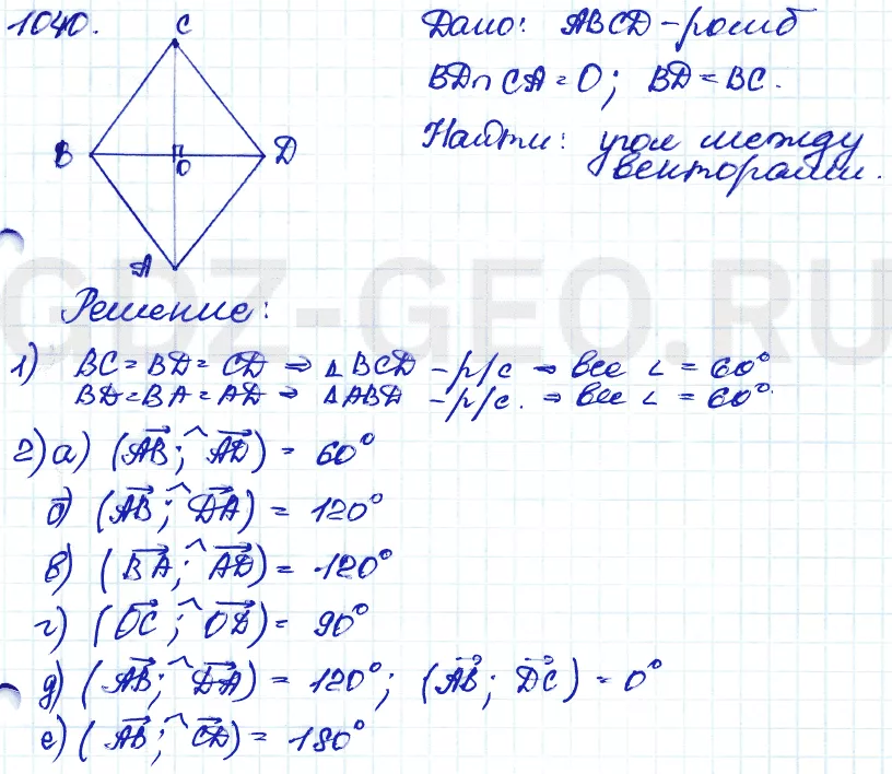 Диагонали ромба ABCD пересекаются в точке О, и диагональ BD равна стороне ромба. Найдите угол между векторами: а) и ; б) и ; в) и ; г) и ; д) и ; е) и .