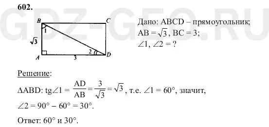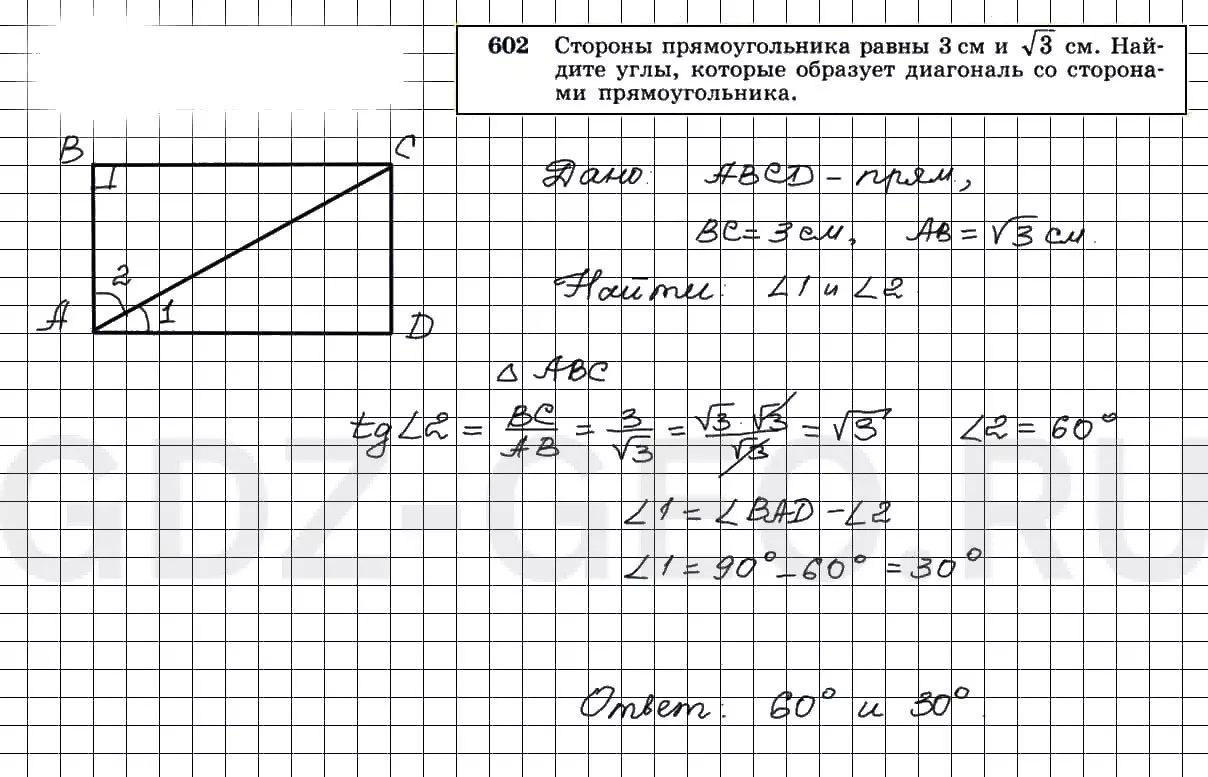 Стороны прямоугольника равны 3 см и см. Найдите углы, которые образует диагональ со сторонами прямоугольника.