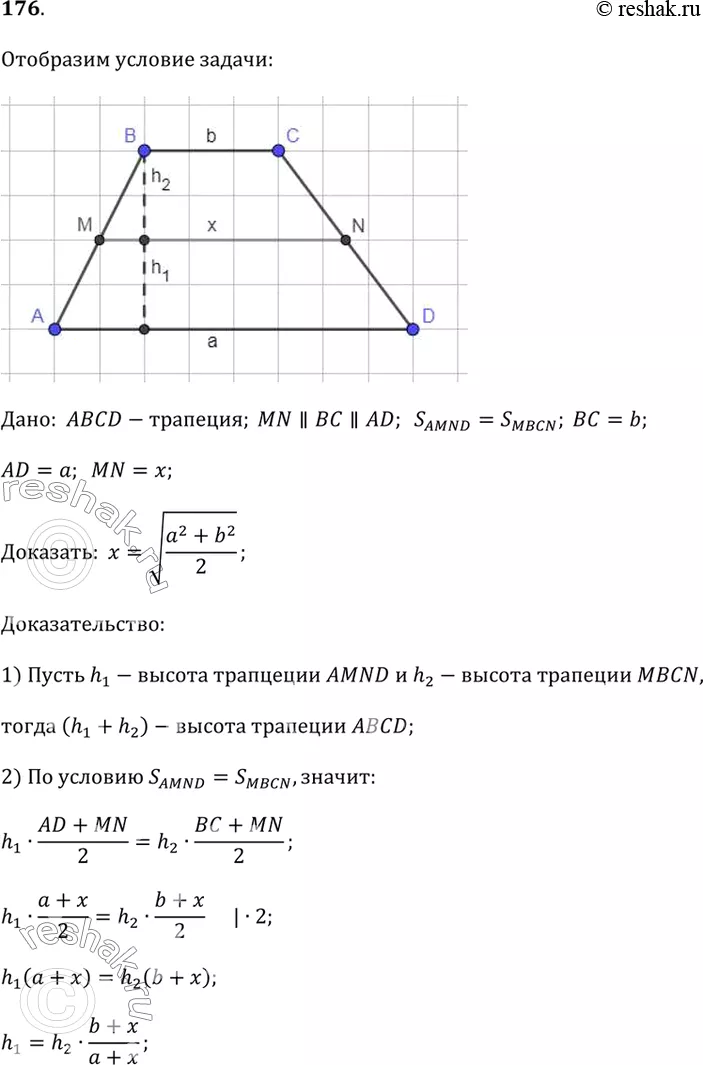 176. Покажите, что в трапеции ABCD отрезок, параллельный основаниям и делящий трапецию на две трапеции равной площади, равен среднему квадратичному оснований.