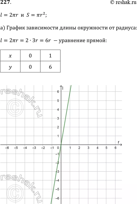 227. Длина окружности l вычисляется по формуле l = 2?r, а площадь круга S — по формуле S = ?r^2, где r — радиус. Постройте график зависимости: