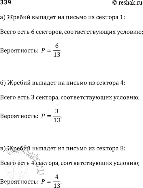 339. В игре «Что? Где? Когда?» на столе осталось 3 письма (рис. 2.55). Волчок крутится по часовой стрелке. Если стрелка останавливается на уже пустом секторе, то выбирается письмо, ближайшее по направлению вращения волчка. Какова вероятность того, что жребий падёт на письмо: