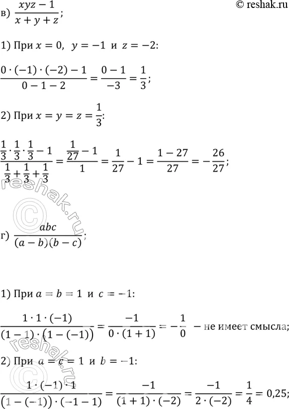 в) (xyz - 1)/(x + y + z) при x = 0, y = -1, z = -2; при x = y = z = 1/3;