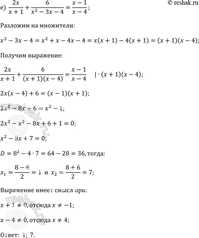 е) 2x/(x + 1) + 6/(x^2 - 3x - 4) = (x - 1)/(x - 4).