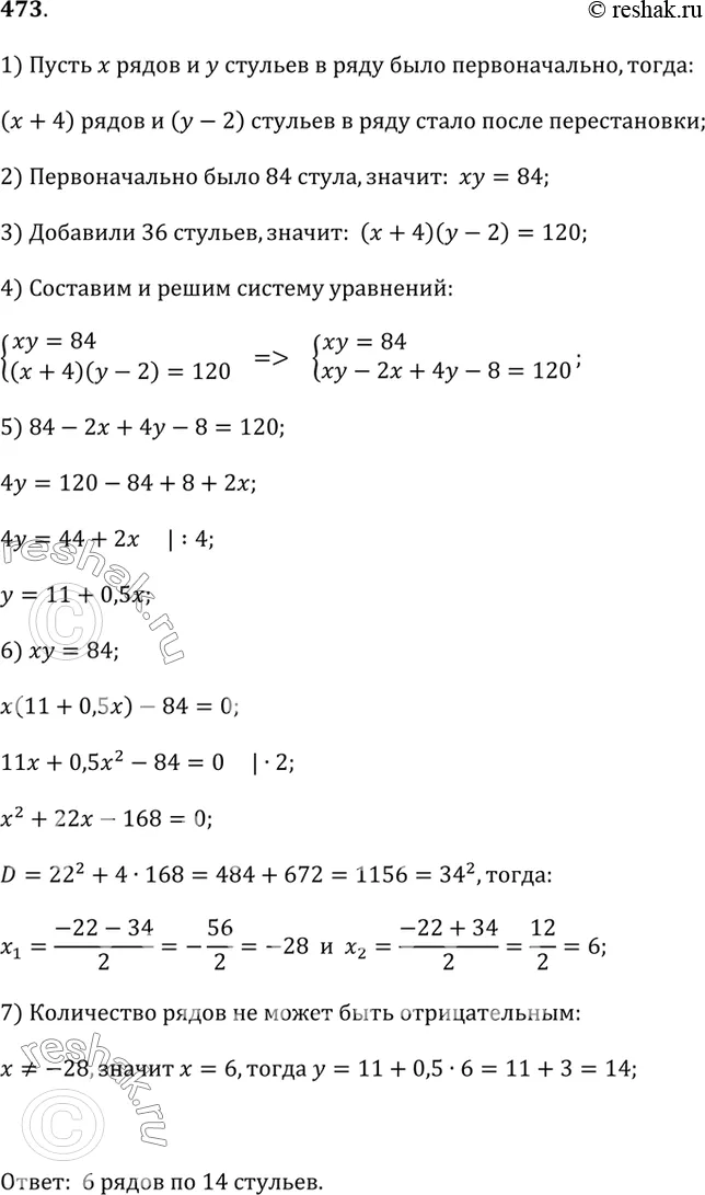 473. В аудитории расставили одинаковыми рядами 84 стула. Затем добавили 36 стульев и при этом сделали перестановку: в каждом ряду уменьшили число стульев на 2, но увеличили число рядов на 4. Сколько рядов и сколько стульев в каждом ряду было в аудитории первоначально?