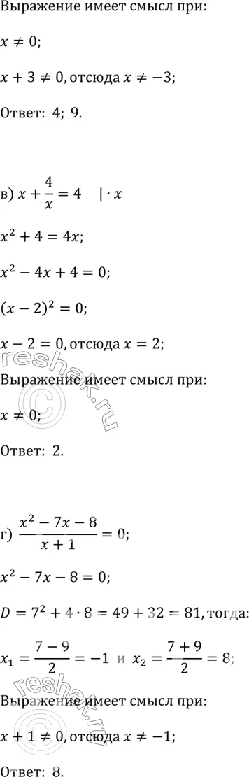 г) (x^2 - 7x - 8)/(x + 1) = 0;