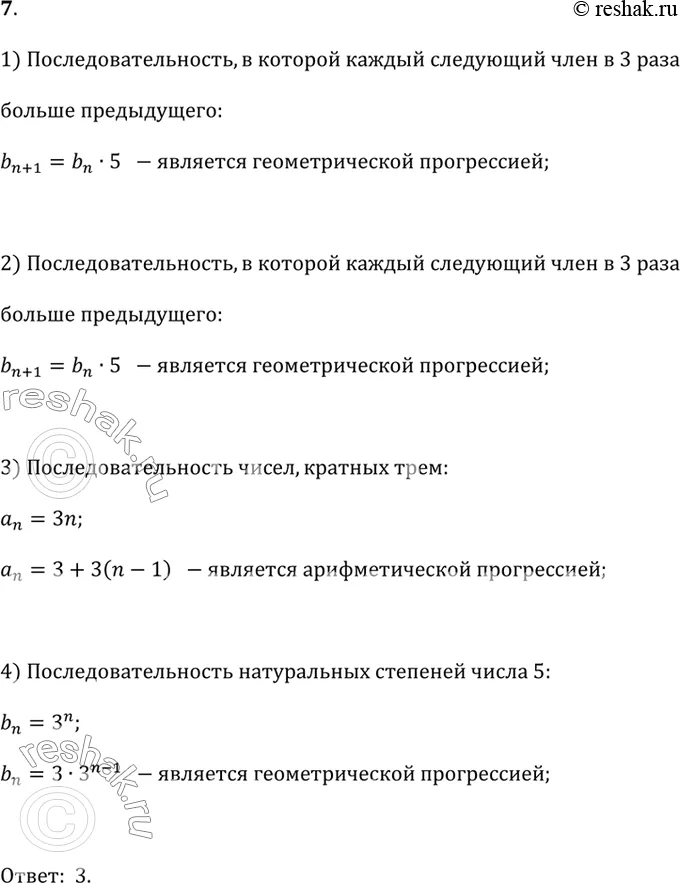 1) последовательность, в которой каждый следующий член в 3 раза больше предыдущего;