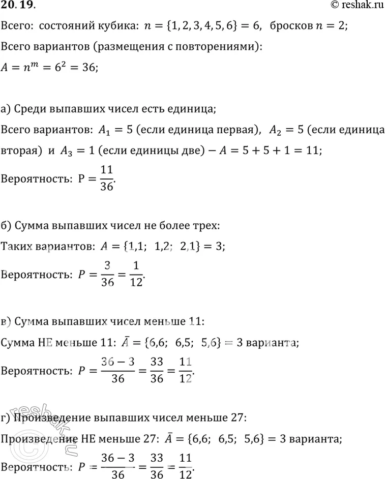 20.19. Игральный кубик бросили дважды. Найдите вероятность того, что: