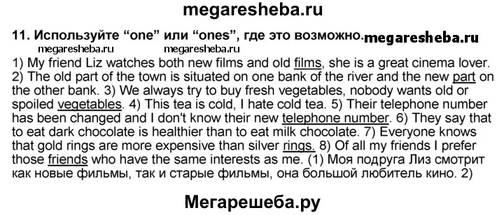 Change the sentences and use one or ones where possible. 1) My friend Liz watches both new films and old films, she is a great cinema lover. 2) The old part of the town is situated on one bank of the river and the new part on the other bank. 3) We always try to buy fresh vegetables, nobody wants old or spoiled vegetables. 4) This tea is cold, I hate cold tea. 5) Their telephone number has been changed and I don’t know their new telephone number. 6) They say that to eat dark chocolate is healthier than to eat milk chocolate. 7) Everyone knows that gold rings are more expensive than silver rings. 8) Of all my friends I prefer those friends who have the same interests as me.