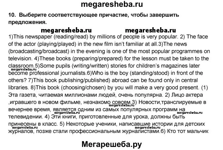 Choose the appropriate participles to complete the sentences. 1) This newspaper read by millions of people is very popular. 2) The face of the actor playing in the new film isn’t familiar at all. 3) The news broadcast in the evening is one of the most popular programmes on television. 4) These books prepared for the lesson must be taken to the classroom. 5) Some pupils writing stories for children’s magazines later become professional journalists. 6) Who is the boy standing in front of the others? 7) This book published abroad can be found only in central libraries. 8) This book chosen by you will make a very good present.