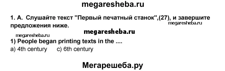 Listen to the text “The First Printing Press” and complete the sentences below. Текст аудирования: THE FIRST PRINTING PRESS The first printing was done by the Chinese and Japanese in the 5 th century. At that time books were very hard to make and few people could read or write, so when a new book appeared it was a great event and each book was unique. The first printers used blocks of wood and cut letters and pictures in them. The process was slow and hard. It took nearly a thousand years before any real change was made in the method used to reproduce the written word. Many men worked on the problem. Johann Gutenberg, a German printer living in Mainz, is generally believed to be the man who first solved the problem. Gutenberg had the idea of using metal instead of wood and make the metal plates move. He printed his first book, the famous Gutenberg Bible, by this method between 1453 and 1456. Gutenberg’s type used individually made letters which could be easily put into words, lines and pages. This system is still in use today. In England the first real printing press was used by William Caxton. He had learned the method of printing in Germany. In 1477 Caxton’s press at Westminster produced “Dictes”, the first dated book printed in England. Altogether Caxton published more than 90 books, they included his own translating from French and Latin. 1) People began printing texts in the 5th century a) 4th century b) 5th century c) 6th century 2) The first printers lived in China a) Europe b) America c) China 3) In his press Johann Gutenberg used letters made of metal a) metal b) stone c) wood 4) The first book Gutenberg printed was The Bible a) The Bible b) “Dictes” c) his own translating from other languages 5) William Caxton printed his first book after Gutenberg a) before Gutenberg b) after Gutenberg c) at the same time as Gutenberg 6) Caxton didn’t only print books, he also translated them a) illustrated them b) wrote them c) translated them B. What do you know about the first printer and the first printed books in Russia?