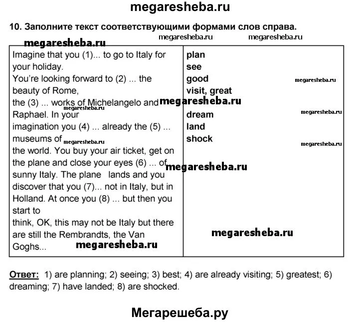 Complete the text with the appropriate forms of the words in the asterisks. Imagine that you (1) are planning to go to Italy for your holiday. You’re looking forward to (2) seeing the beauty of Rome, the (3) best works of Michelangelo and Raphael. In your imagination you (4) are already visiting already the (5) greatest museums of the world. You buy your air ticket, get on the plane and close your eyes (6) dreaming of sunny Italy. The plane lands and you discover that you (7) have landed not in Italy, but in Holland. At first you (8) are shocked but then you start to think, OK, this may not be Italy but there are still the Rembrandts, the Van Goghs…
