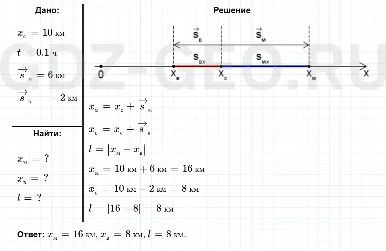 Мотоциклист, переехав через мост, движется по прямолинейному участку дороги. У светофора, находящегося на расстоянии 10 км от моста, мотоциклист встречает велосипедиста. За 0,1ч с момента встречи мотоциклист перемещается на 6 км, а велосипедист — на 2 км от светофора (при этом оба они продолжают двигаться прямолинейно в противоположных направлениях). Определите координаты мотоциклиста и велосипедиста и расстояние между ними спустя 0,1ч после их встречи. У к а з а н и е: начертите ось X, направив её в сторону движения мотоциклиста и приняв за тело отсчёта мост. Обозначьте на этой оси координату светофора (хс), координаты велосипедиста (хв) и мотоциклиста (хм), которые они имели через 0,1ч после встречи. Над осью начертите и обозначьте векторы перемещений велосипедиста и мотоциклиста , а на оси — проекции этих векторов (sвх и sмx).