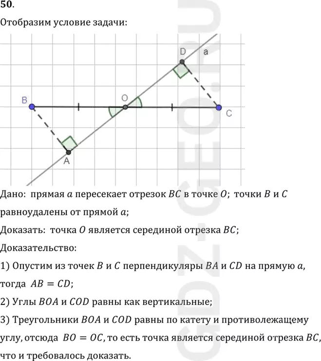 50. Отрезок ВС пересекает прямую а в точке О. Расстояния от точек В и С до прямой а равны. Докажите, что точка О является серединой отрезка ВС.