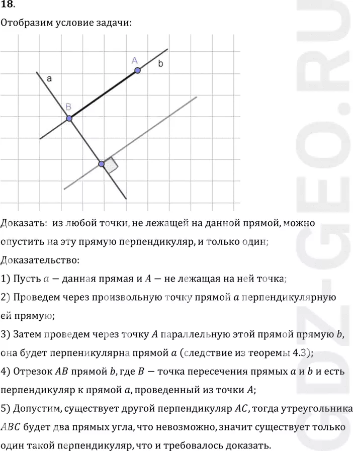 18. Докажите, что из любой точки, не лежащей на данной прямой, можно опустить на эту прямую перпендикуляр, и только один.